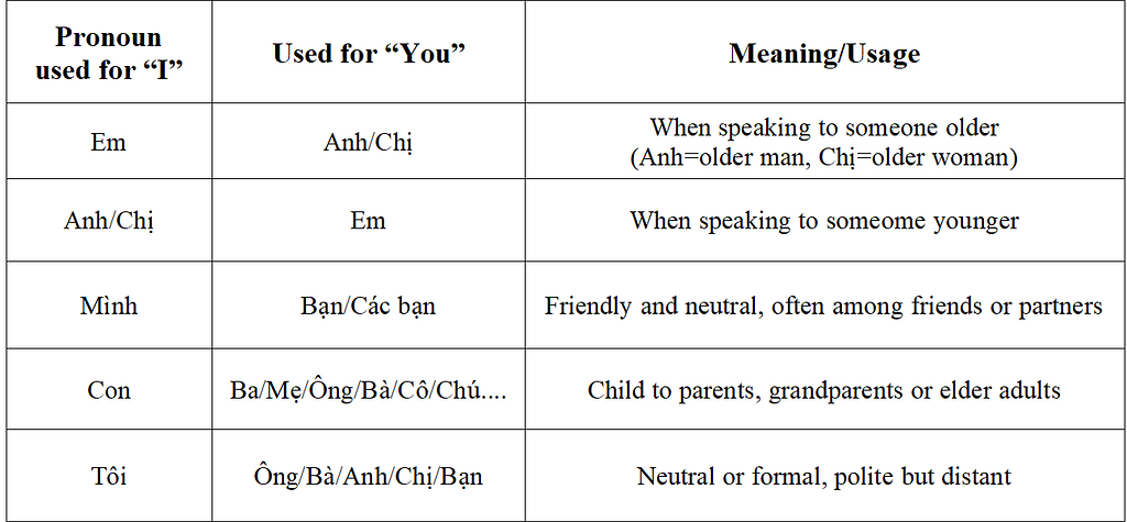 In Vietnamese, the way people address each other is very important and reflects the social relationship between speakers, including age, gender, family role, and social status. Unlike English, which mostly uses "I" and "you," Vietnamese pronouns are more complex and context-dependent.